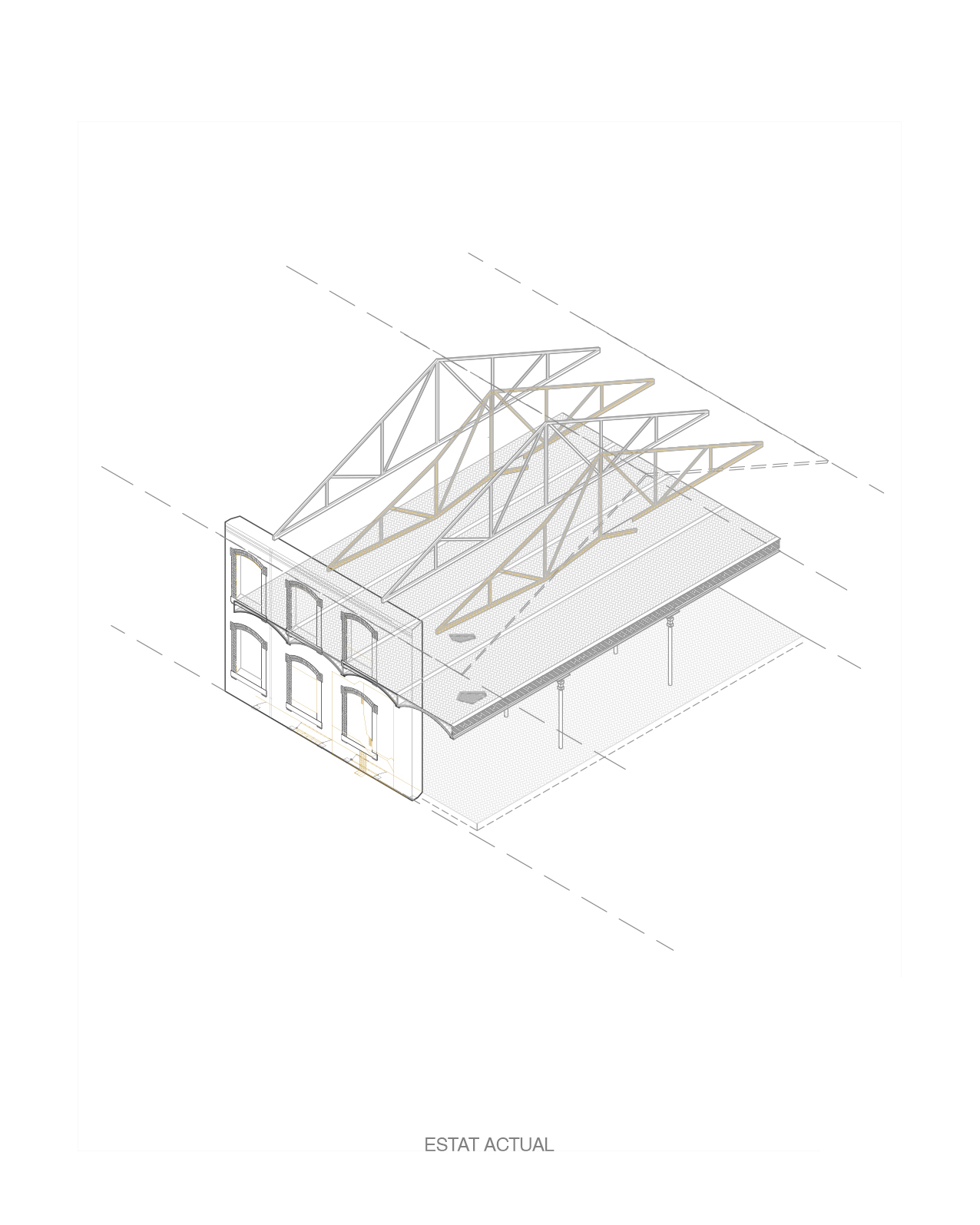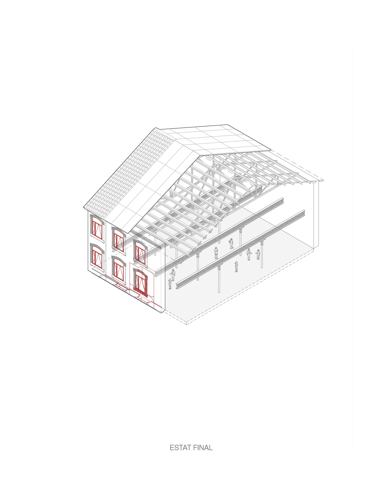 L’edifici presenta un estat de deteriorament avançat, amb sectors de coberta enfonsats i obertures en mal estat. El projecte comporta mesures de desmuntatge i enderroc interiors per deixar l’espai buit i preparat per a futurs usos. En els propers anys, l’edifici acollirá una residencia per gent gran. Per tant, el projecte busca deixar els espais lliures per facilitar les intervencions posteriors.
