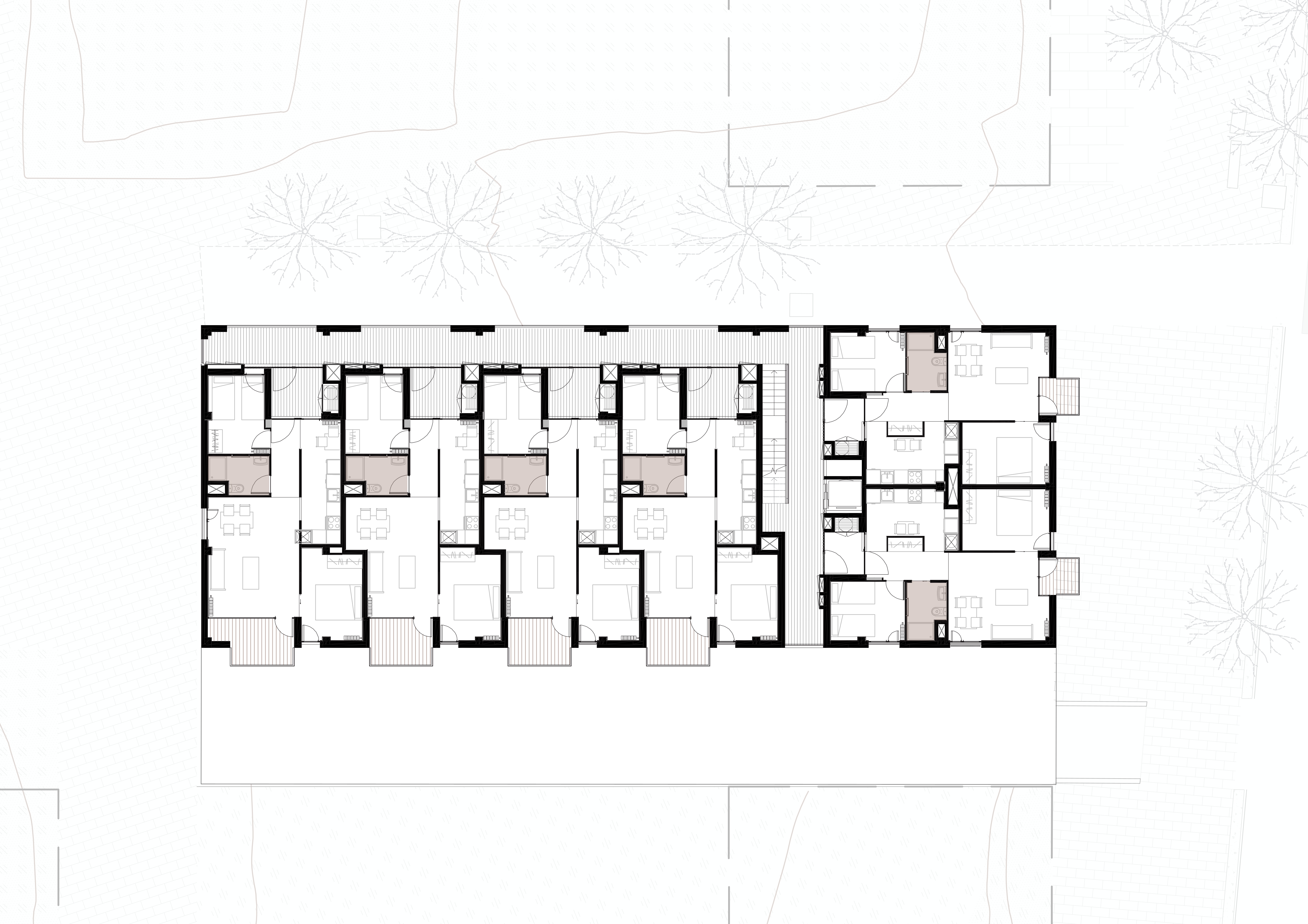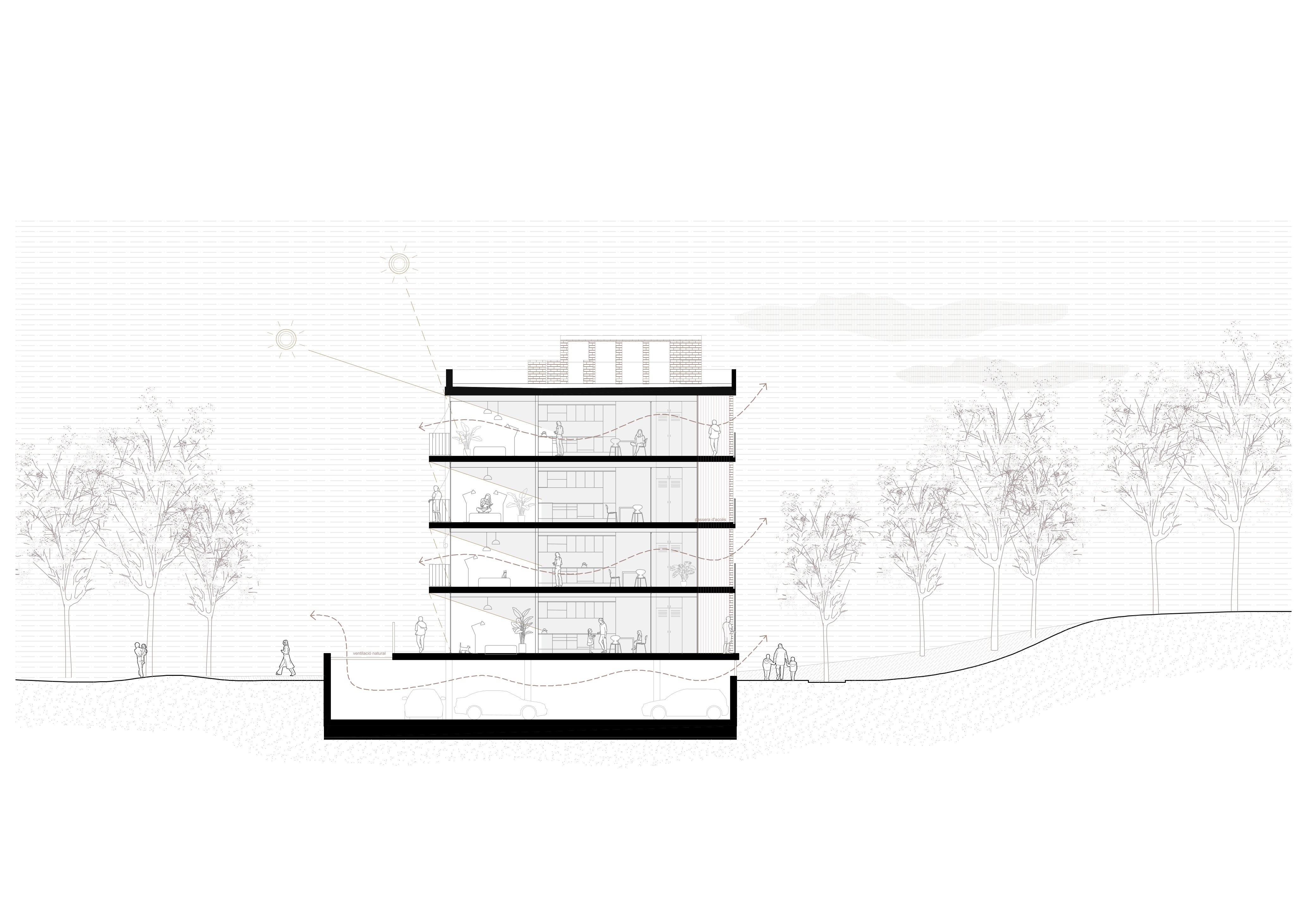 All dwellings have an exterior terrace which is partially set back into facade to obtain a better protection against wind and to get some privacy from neighbors. Additionally, solar protections are located to control temperature and as a good passive measure to reduce energetic consumption and user comfort.